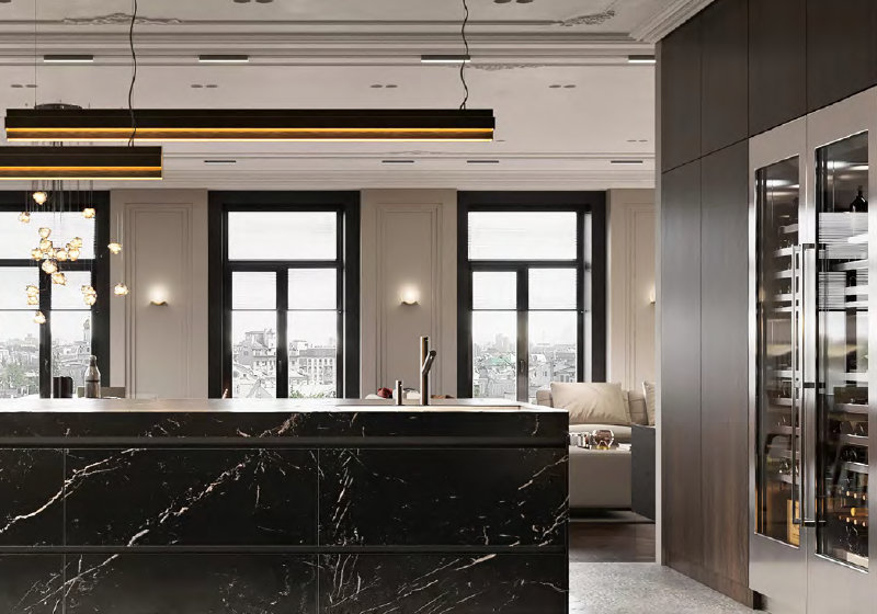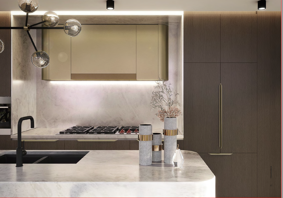 Inspired by all that the residence stands for, DeNoche is a daring design that offers a sense of warmth and tranquility by its colour palette of dark oak and moonlit night. Brass accents are accentuated throughout the space by virtue of a brooding backdrop, and the kitchen’s centerpiece: the marble topped kitchen aisle on timber floor, stands out amongst the dominant browns.